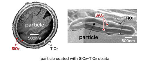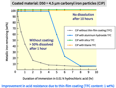In TFCP, the nano-film is formed through a solution reaction. It is a desirable formation method for powdery base materials. Through a solution reaction, it is possible to generate a film precipitation that can coat the surface of particulate base material evenly, thanks to the surface energy of the base material particles in the solution.